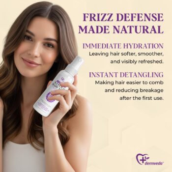 Enter Ultra Frizzfade Hair Mist. This lightweight detangler and anti-frizz spray is your secret weapon for effortlessly smooth, touchable hair. Formulated with amla, flaxseed, marshmallow root, and silk aminos, it hydrates and protects strands while controlling frizz. Spray it on damp or dry hair, comb through, and enjoy silky, manageable locks all day long.